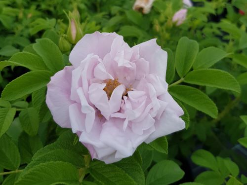 'Snow Pavement'-lajikkeen suurten tuoksuvien puolikerrottujen kukkien väri vivahtaa ensin liilaan vaalentuen ennen lakastumista lähes valkoiseksi. Kasvutavaltaan pensas on tuuhea ja matalahko. Lehdistö on tummanvihreä ja oranssinpunaisia kiulukoita muodostuu runsaasti. Käyttö yksittäin, ryhmissä, vapaasti kasvavana aidanteena, sekä katu- ja tiealueilla. Kasvukorkeus 1-1,5 m.