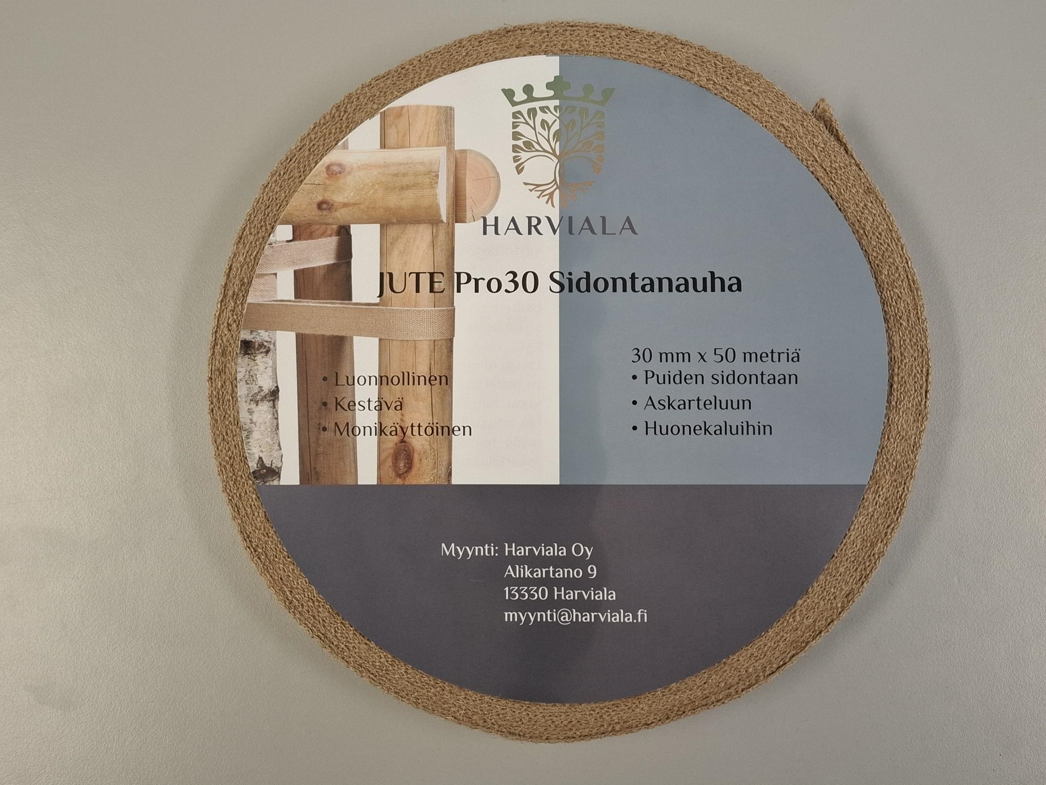 Taipuisasta ja kestävästä luonnollisesta juuttikankaasta valmistettu Harviala JutePro 30 -sidontanauha. Nauhan leveys 3 cm, rullalla 50 m.